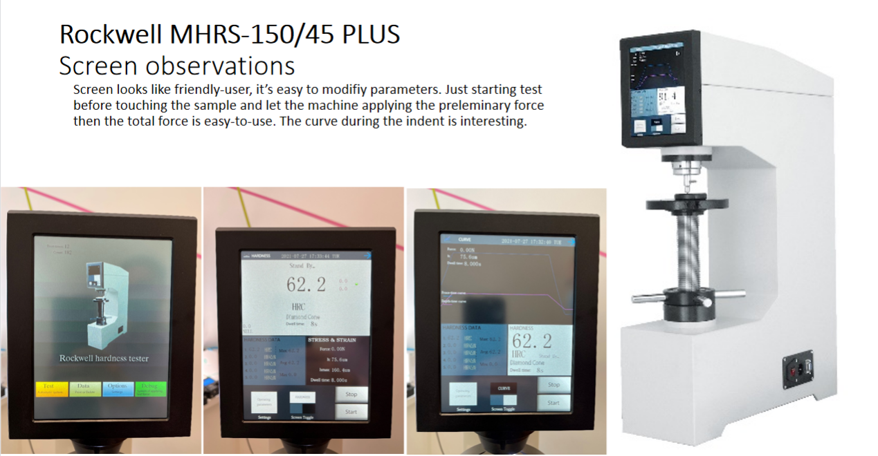 客户反馈如下:屏幕设计看起来对用户很友好的,参数也很容易修改。在接触样品之前,只需开始测试,并让机器施加触发力,总试验力很方便使用(本产品初试验力和主试验力都是机器自动加载,手动只需要让工件和压头接触给触发力,机器便自动完成加载初试验力和主试验力、以及保荷和卸载过程)。测试过程中的曲线很有趣(本产品在测量过程中可实时显示力值和压痕深度曲线)。